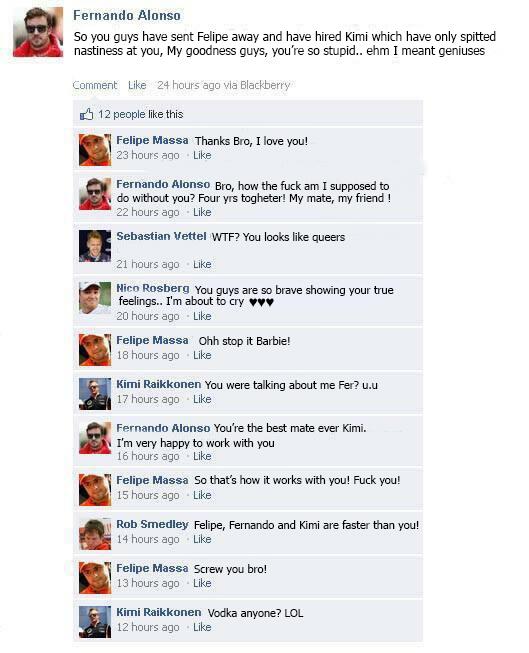 - La nostra scuderia l'anno prossimo cambierà nome e si chiamerà Bye-bye-team. Siamo gli unici ad aver raggruppato cinque elementi su sei che lasceranno la propria squadra o hanno forti dubbi sulla riconferma. Nell'ordine Webber, Ricciardo, Massa e i due Mclaren. Bottas è l'unico a rimanere (e detto fra noi l'elemento più insignificante di tutto il gruppo). E' ufficiale, portiamo sfiga.
